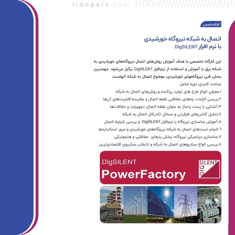 این پکیج شامل 9 ساعت فیلم آموزشی است. در این فیلم آموزشی ضمن آموزش نرم افزار دیگسایلنت به اتصال به شبکه نیروگاههای تولید پراکنده و نیروگاههای خورشیدی پرداخته می شود تا با آموزش مفاهیم تخصصی برق امکان یادگیری نرم افزار و درک درست کارکرد ابزارهای مختلف آن فراهم شود. در این پکیج، نسخه 2022 دیگسایلنت DIgSILENT PowerFactory 2022 تدریس شده است.